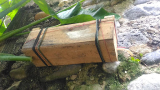 1. Kotak buatan, bisa dibuat sederhana panjang dan lebar menyesuaikan saja. Biasa kami membuat dengan lebar dan tinggi 5 jari tangan dan panjang 1 jengkal setengah. Kasih 2 lubang. Depan sebagai pintu masuk lebah dan belakang untuk penghubung selang ke pintu masuk asli dan kotak.